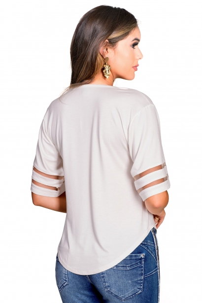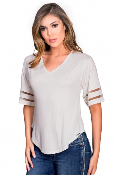 Blusa confeccionada em malha fria com detalhe em transparência tule nos recortes mangas. Modelagem mais ampla com barras arredondadas frente e costas.