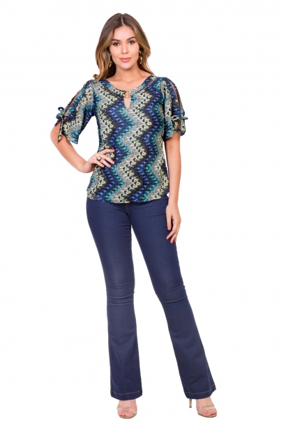 Blusa confeccionada em crepe estampado, modelagem soltinha com detalhe argola de metal no decote