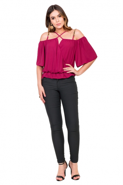 Blusa comprimento cropped, shape amplo, tranpassada frente e detalhes alças cruzadas com metal.
