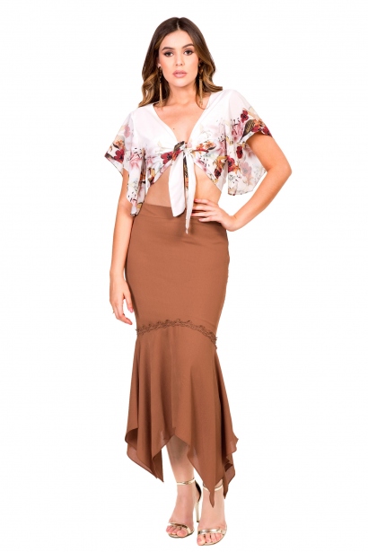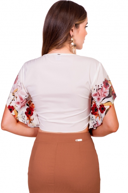 Blusa confeccionada com tecido cetim estampado, modelagem com comprimento cropped, shape amplo e detalha de amarração busto.