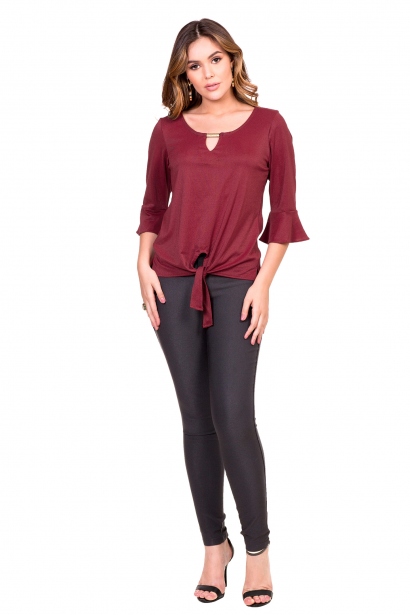 Blusa com amarração barra frente, detalhe metal decote e mangas flare.