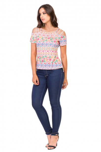 T-shirt estampada confeccionada em malha canelada, ombros vazados e alças tripla.