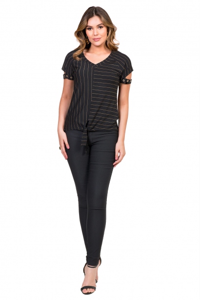 T-shirt listras, com decote em v confeccionada em malha com elastano, amarração frente e detalhe tachas termocolante no recorte da manga.
