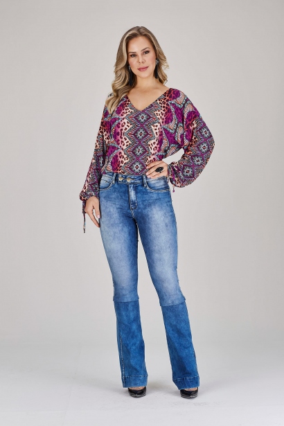 Body Confeccionado Em Viscose Estampada Com Shape Amplo, Abertura Costas E Mangas Com Amarril Punho