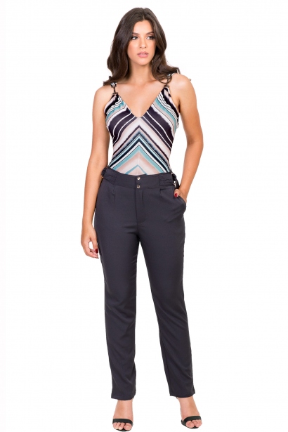 Calça alfaiataria com modelagem slim e detalhe de faixa no cós. Fechamento por zíper e abotoamento em botões de pressão.
