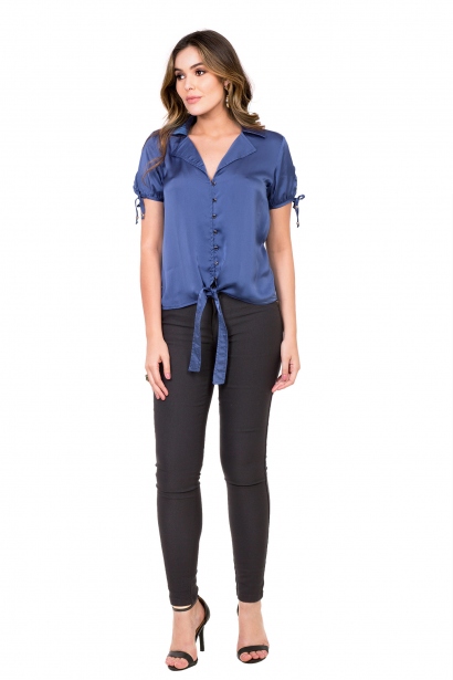 Camisa confeccionada em crepe, modelagem mais soltinha com detalhes viés para amarril mangas, pontas assimétricas para amarração frente e fechamento frontal por botões