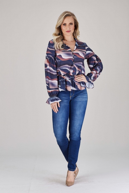 Camisa Estampada, Manga Longa Com Elastex Barra E Abotoamento Frente