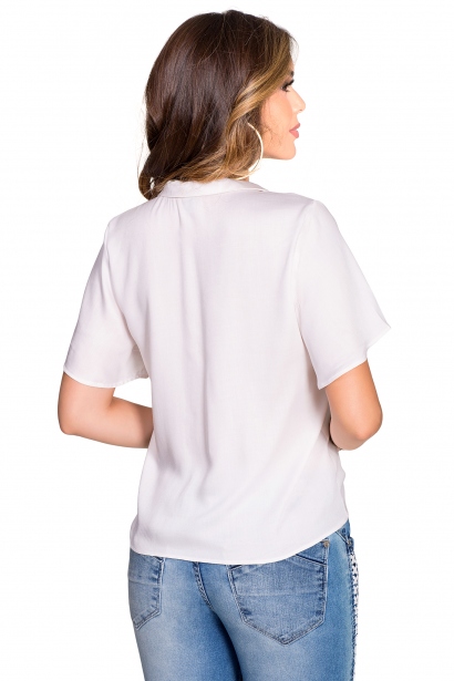 Camisa confeccionada em tecido viscose, modelagem mais soltinha com mangas de comprimento curto levemente amplas. Abotoamento frente e detalhe assimétrico frente que permite amarração