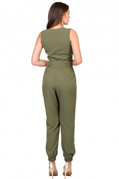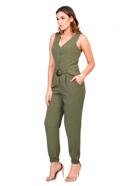 Macacão Confeccionado Em Tecido Crepe Com Toque De Viscose, Fechamento Em Zíper Na Frente E Cinto Com Fivela