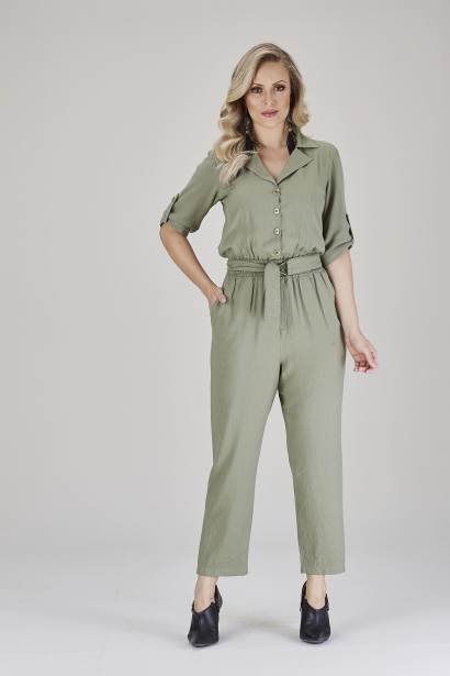Macacão Pantacourt Com Detalhe Em Aboatoamento Parte De Cima, Cós De Elástico Para Melhor Ajuste E Cinto Do Próprio Tecido Com Fivela De Metal. Detalhe Martingale Nas Mangas.