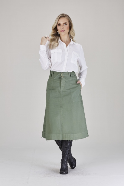 Saia confeccionada em sarja collor, modelagem em formato de "A" com comprimento midi e fechamento por zíper e botão. Lavanderia com tingimento reativo que deixa a cor da peça ainda mais intensa.