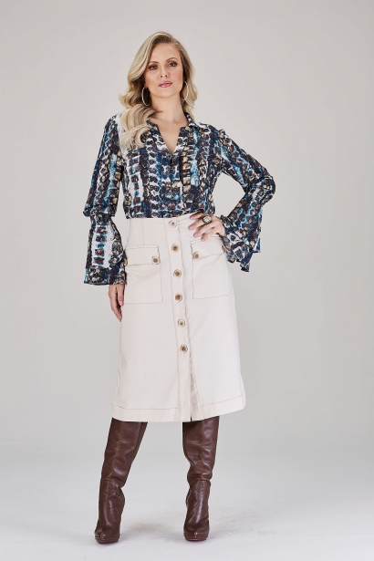 Saia confeccionada em tecido linho, modelagem com comprimento midi com fechamento frontal por botões de massa.