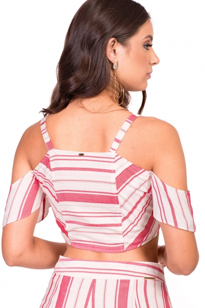 Saia confeccionado em viscose com elastano, padronagem listrado, com abotoamento frente.
