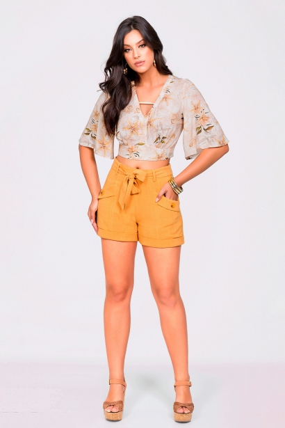 Shorts Confeccionado Em Linho Com Shape Mais Soltinho E Bolsos Frente Tipo Cargo E Faixa Para Amarração