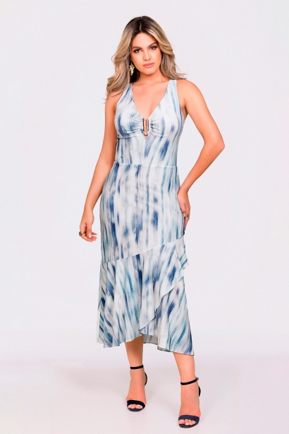 Vestido Midi Estampado, Babado Saia Transpassado Com Detalhe Metal Entrebusto