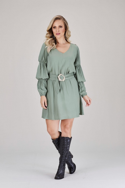 Vestido confeccionado em viscose Twill, modelagem soltinha com mangas franzidas, detalhe de martingale nos ombros e cinto do próprio tecido com acabamento em fivela de acrílico.